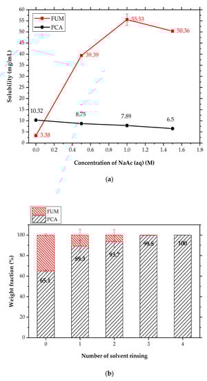 The filter cake was rinsed with NaAc (aq) to remove FUM solids from Form II PCA crystals, which were produced by PCA crystallization in the presence of FUM. The solubilities of FUM and Form I PCA in 0.5, 1, and 1.5 M NaAc (aq) were determined at 10 °C by the above-mentioned method. An amount of 1 g of PCA and 0.5 g of FUM were dissolved in 17 mL of water at 75 °C to prepare a PCA–FUM aqueous solution. The PCA–FUM solution was cooled to 10 °C at a cooling rate of 1 °C/min for 90 min. The produced solids were filtered by cake filtration using a ceramic Büchner funnel and a filter paper with a pore size of 5 μm. An amount of 15 mL of 1 M NaAc (aq) pre-chilled in a 10 °C water bath was poured into the funnel for cake washing. The liquid level should exceed the thickness of a filter cake. The wet cake was rinsed with the NaAc (aq) four times and the time for each rinsing was 5 s. A few milligrams of the wet cake were sampled for HPLC and powder X-ray diffraction (PXRD) analysis. For every washing (rinsing) with NaAc (aq), 15 mL of cold water was used to exchange the remaining NaAc (aq) on the wet cake for a solvent swap. Finally, the cake was dried in a 40 °C oven overnight.