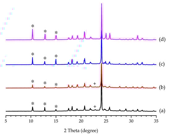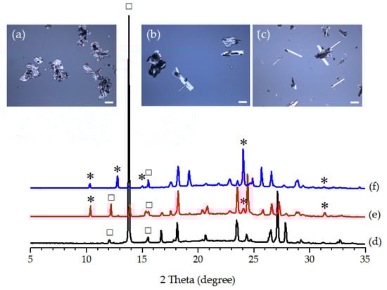 Concerning seeding in the PCA–additive aqueous solutions (i.e., with the assistance of additives) with the corresponding additives as a seed, a mixture of Forms I and II PCA was formed in the case of ADI (Figure 6a), in agreement with to the outcome of “Effect of Additive Amount” at 100 wt% of ADI (Table 2). The presence of ADI crystals could induce the nucleation of Form II PCA. However, its polymorphic transformation to Form I was followed in the case of ADI, where a trace amount of Form I PCA was noticed, as shown in Figure 6a. The formation of Form I PCA crystals might also be attributed to the inevitable polymorphic transformation happening in the case of seeding in the PCA–FUM solution with FUM (Figure 6b). Seeding in the PCA–MLC and PCA-OXA solutions, respectively, with MLC and OXA, brought about the formation of Form I PCA alone (Figure 6c,d). Remarkably, pure Form II PCA crystals were received by seeding with SUC, as evidenced in Figure 6e.