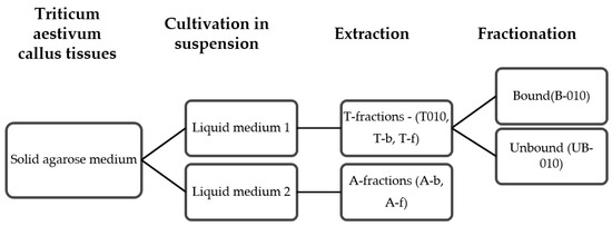 In total, seven PS fractions were obtained and used for the study of the effect on CRC cells and their mechanism of action. These fractions differed from each other in terms of the nutrient media for wheat cell cultivation, cultivation time, and fractionation (Figure 1).