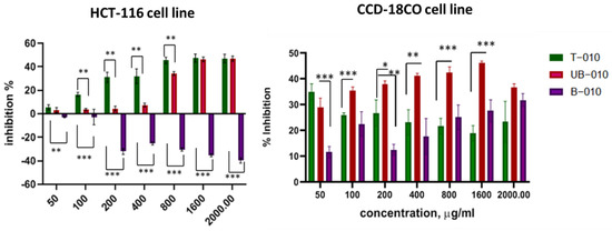 Inhibition of HCT-116 colon cancer cell line and CCD118 CO normal colon cell line proliferation (in %) under the influence of different concentrations of T−010, B−010, and UB−010 fractions. Fractionated PSs (T−010—total fraction, B−010—bound fraction, UB−010—unbound fraction). (*** p < 0.001, ** p < 0.01 and * p < 0.05 versus control).