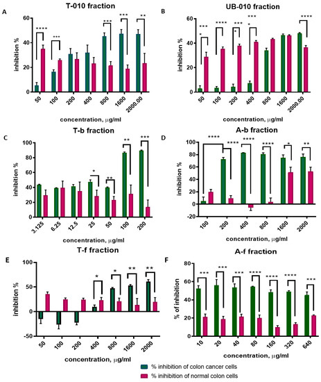 Inhibitory activity of PS fractions on the normal colon cell line CCD118 CO, compared with inhibition of colon cancer cells of the HCT−116 line. T−010 fraction (A), UB−fraction (B), T−b fraction (C), A−b fraction (D), T−f fraction (E); A−f fraction (F); (A,C,E) T−fractions; (D,F) A−fractions; UB–unbound fraction (**** p < 0.0001, *** p < 0.001, ** p < 0.01 and * p < 0.05 versus control).