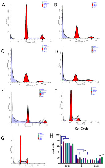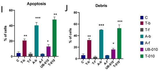 Cell cycle and apoptosis of HCT-116 colon cancer cells treated by WCCPS. (A)—untreated cells, (B)—A−b fraction, (C)–T−010 fraction, (D)—UB−010 fraction, (E)—T−b fraction (2× IC50), (F)—A−f fraction, (G)—T−f fraction, (H)—cell cycle, (I)—debris, (J)—apoptosis. (*** p < 0.001, ** p < 0.01 and * p < 0.05 versus control).