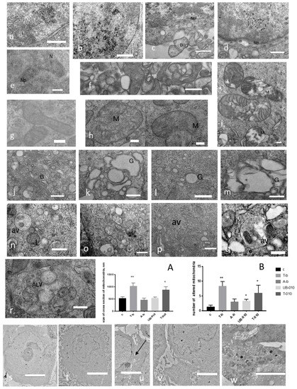 Transmission electron microscopy of the HCT-116 cell line treated by WCCPS in concentrations of IC50. (Scale bar: (a,b,e,j,k,l–r)—400, (c,d,f)—600, (g–i)—200, (s–w)—5000 nm), (a)—nucleus of untreated cells, (b,c)—nucleus with condensed chromatin and nuclear pores, apoptotic blebs of cells treated by T-010, (d)—nucleus of cells treated by T-b fraction, condensation chromatin, nuclear pores (Np) (2× IC50), (e)—nucleus of cells treated by A-b fraction, (f)—blebs in intercellular space between cells treated by UB-010 fraction, (g)—mitochondria of non-treated cells, (h)—mitochondria treated by T-010, (i)—mitochondria treated by T-b fraction, (j)—Golgi apparatus of non-treated cell, (k)—swollen Golgi apparatus in cells treated by T-010, (l) –Goldi (A-b fraction), (m)—Golgi apparatus (T-b fraction), (n)—lysosomes and autophagic vacuole of untreated cell, (o)—accumulation of multiple autophagic vacuoles with double and single membrane (T-010), (p)—autophagic vacuoles with double and triple membrane, (q)—vesicles in cell treated by T-b fraction, (r)—double membrane autophagic large vesicle in cell treated by UB-010 fraciton, (s)—untreated cell, (t)—cells treated by A-f fraction—brush borders, (u)—tight junctions between cells (A-f fraction), (v)—cryptae structures (A-f fraction), (w)—cells treated by T-f fraction—plenty of vesicles in intercellular space; (A)—the diameter of cross section of mitochondria, (B)—number of damaged mitochondria per picture. N-nucleus, Np—nuclear pores, M—mitochondria, G—Golgi apparatus, L—lysosome, av—autophagic vesicles; ALV—autophagic large vesicle, arrow—tight cell junctions. (** p < 0.01 and * p < 0.05 versus control).