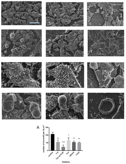 Scanning electron microscopy of HCT-116 cells treated by PS fractions. Magnification ×3000, 50 µm: (a)—untreated cells, (b)—T-010 fraction, (c)—A-b fraction, (d)—UB-010 fraction, (e)—T-b fraction IC50, (f)—T-b fraction with 2× IC50; Magnification ×9975, 10 µm: (g)—untreated cell, (h)—T-010 fraction, (i)—A-b fraction, (j)—UB-D fraction, (k)—T-b in concentration of IC50, (l)—T-b fraction 2 IC50, (A)—number of microvilli per 10 µm. (*** p < 0.001, ** p < 0.01 and * p < 0.05 versus control).