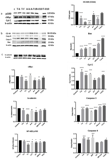 The levels of NF-kB p100 were reduced by the T-f, A-b, A-f, and UB-010 fractions. The T-f fraction reduced levels to 0.65 of control, whereas the A-b, A-f and UB-010 fractions reduced levels to 0.8. The T-010 and T-b fractions had no significant effect on the levels of Nf-kB2 p100 (Figure 7). The T-f, A-f, and UB-010 fractions showed their capacity, similar to c-Myc inhibition, to have a decreasing effect on the Nf-kB pathway, participating in differentiation processes.