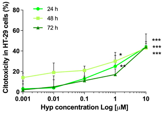 Figure 1. Hypericin cytotoxicity in HT-29 2D cells. Cytotoxicity curves in HT-29 2D cell cultures were obtained by incubating cells with increasing concentrations of Hyp (0.001, 0.01, 0.1, 1, and 10 μM). WST-1 assay was carried out to evaluate Hyp cytotoxicity that was expressed as a percentage compared with untreated cells after 24, 48, and 72 h of incubation. Statistically significant difference versus untreated cells: * p ≤ 0.05, ** p ≤ 0.01, and *** p ≤ 0.001 (n = 2).