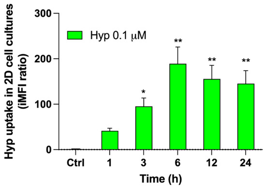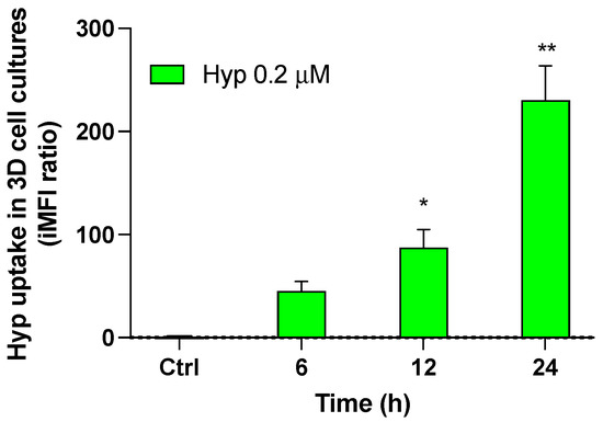 Figure 2. Hypericin uptake in 2D HT-29 cell cultures. HT-29 cells were incubated for 1, 3, 6, 12, and 24 h with 0.1 μM Hyp. Fluorescent signals were detected using a flow cytometer at 488 nm excitation to measure the intracellular amount of Hyp that was expressed as iMFI ratio versus untreated cells (Ctrl). Statistically significant difference versus untreated cells (Ctrl): * p ≤ 0.05, ** p ≤ 0.01 (n = 3).