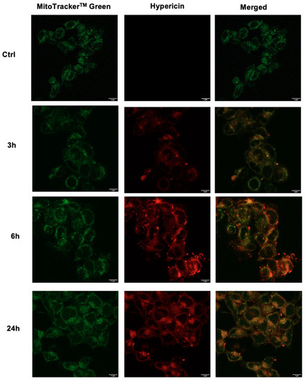 A confocal fluorescence analysis of Hyp in HT-29 cells was then performed to confirm the cytofluorimetric data by establishing Hyp cellular localization, as cellular localization can significantly influence the sonodynamic activity of Hyp. In the same procedure as the cytofluorimetric study of Hyp uptake, HT-29 cells were incubated for 3, 6, and 24 h with 0.1 μM Hyp. By staining mitochondria with an appropriate probe, MitoTrackerTM green, overlay imaging analysis revealed that Hyp displayed cytoplasmic distribution, specifically at the mitochondrial level (Figure 3). The mitochondrial localization of Hyp increased over time, in accordance with the cytofluorimetric study of Hyp cellular uptake (Figure 2). Moreover, the accumulation of Hyp clusters close to the cell membrane was observed.