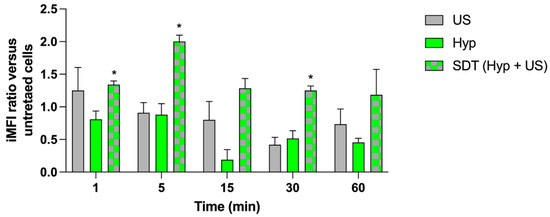 Since the ability of Hyp to provoke ROS production under PDT treatment has been reported in the literature [42], we thought it would be interesting to analyze ROS production under US exposure. As observed in Figure 4, slight, but statistically significant, ROS generation was observed in HT-29 cells under the combined treatment of Hyp and US over time (p ≤ 0.05), with the maximum being found 5 min after treatment. Moreover, the signal, expressed as iMFI ratio versus Ctrl (i.e., untreated cells), remained almost constant up to 1 h after treatment.