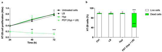 As Hyp is a well-known photosensitizer, the effects of PDT with Hyp on HT-29 cell proliferation were evaluated, using the selected noncytotoxic concentration of Hyp (0.1 μM), 24, 48, and 72 h after treatment. A significant reduction in HT-29 cell proliferation was observed only when the HT-29 cells underwent PDT, starting from 48 h after treatment, whereas no significant effect was observed in untreated cells, cells treated with Hyp only, and cells exposed to LB only (Figure 5a). A marked increase in the percentage of dead cells (58.34 ± 6.47%, p ≤ 0.001) and a statistically significant decrease in the percentage of live cells (41.66 ± 4.93%, p ≤ 0.001), both compared with untreated cells, were observed 48 h after the photodynamic treatment of HT-29 cells with Hyp and LB (Figure 5b).