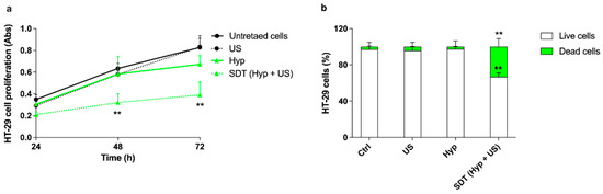 To verify the responsiveness of Hyp, acting as a sonosensitizer, to US, the effects of Hyp-SDT were evaluated on HT-29 cell proliferation using a Hyp noncytotoxic concentration of 0.1 μM. A statically significant decrease in cell proliferation was observed when HT-29 cells underwent Hyp-SDT, starting from 48 h after treatment (Figure 6a). A significant increase in the percentage of dead cells (33.20 ± 8.97%, p ≤ 0.01) and a statistically significant decrease in the percentage of live cells (66.60 ± 4.25%, p ≤ 0.01), both compared with untreated cells, were observed 48 h after the sonodynamic treatment of HT-29 cells with Hyp and US (Figure 6b).