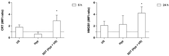 Figure 7. Evaluation of CRT and HMGB1 after hypericin-mediated sonodynamic treatment. HT-29 cells were incubated for 24 h with 0.1 μM Hyp and then exposed to US (1.5 W/cm2 at 1.5 MHz, continuous wave mode for 5 min). The presence of CRT and HMGB1 was evaluated 6 and 24 h after treatment, respectively. Results are expressed as iMFI ratio. Statistically significance of treated cells versus untreated cells (dashed line): * p ≤ 0.05 (n = 3).