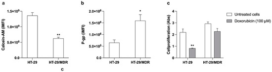 The acquired MDR in HT-29/MDR cells was verified by cytofluorimetric analysis of calcein-AM, a substrate of P-gp that can highlight differences in its own cellular internalization according to P-gp expression. The results were compared with the ones obtained from the parental cell line, HT-29. HT-29/MDR cells presented a significantly lower internalization of calcein-AM than HT-29 cells (Figure 8a, p ≤ 0.01). To confirm the resistant phenotype in HT-29/MDR cells, P-gp expression was also evaluated using a specific P-gp antibody to allow its cytofluorimetric detection. The cytofluorimetric analysis displayed a 2.4-fold increase in P-gp expression of HT-29/MDR cells compared with HT-29 cells (Figure 8b). Moreover, the cytotoxic effect of a chemotherapeutic drug that is a well-known P-gp substrate, doxorubicin [45], was evaluated at a concentration (100 μM) above its IC50 value [46]. After 48 h of doxorubicin incubation, a significant decrease in HT-29 cell proliferation was observed, while no significant effect on cell proliferation was observed in HT-29/MDR (Figure 8c).