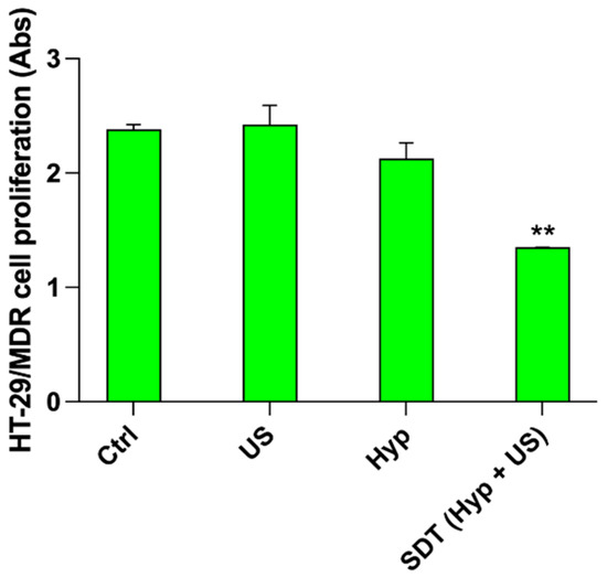 Moreover, when HT-29/MDR cells underwent sonodynamic treatment with Hyp, a statistically significant reduction in cell proliferation was observed after 48 h (Figure 9, p ≤ 0.01) unlike what was observed when incubating the cells with doxorubicin (Figure 8c).