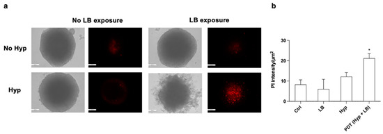 The effect of photodynamic treatment with Hyp on HT-29 spheroids was first evaluated by analyzing their shape using optical microscopy. HT-29 spheroids that underwent PDT with Hyp showed significant shape modification, with a loss of central density, 48 h after treatment. No modifications in the HT-29 spheroid shape were observed in spheroids treated with Hyp only or those exposed to LB only (Figure 11a). The PDT effect was then evaluated by incubating spheroids with PI to detect dead cells via fluorescence microscopy, 48 h after treatment. Only HT-29 spheroids that underwent PDT showed a significant increase in PI fluorescence compared with untreated spheroids (Figure 11b).