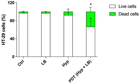 The effect of Hyp-PDT on the HT-29 spheroids was then evaluated by analyzing cell death using flow cytometry. As shown in Figure 12, a statistically significant increase in the percentage of dead cells (33.22 ± 9.81%, p ≤ 0.05) and a statistically significant decrease in the percentage of live cells (66.78 ± 12.68%, p ≤ 0.05), both compared with untreated spheroids, were observed 48 h after the photodynamic treatment of HT-29 spheroids with Hyp and LB, which is in line with the results of the microscopy analyses (Figure 11).