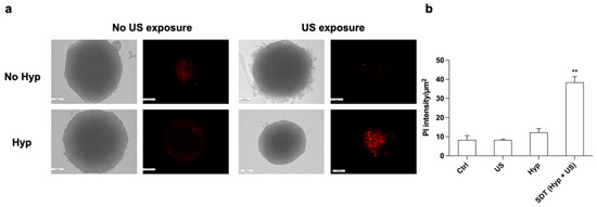 The effect of Hyp-SDT on the HT-29 spheroids was first evaluated by analyzing their shapes with optical microscopy. HT-29 spheroids that underwent Hyp preincubation, followed by US exposure, showed clear edges, but they were smaller than those of the untreated spheroids, 48 h after treatment (Figure 13a). The SDT effect was also evaluated by incubating spheroids with PI to detect dead cells, 48 h after treatment. A significant increase in PI fluorescence was observed in SDT-treated spheroids compared with untreated spheroids, while they also maintained their external spheroid shape (Figure 13b).