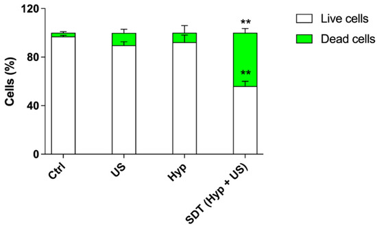 The evaluation of sonodynamic treatment with hypericin on HT-29 spheroids was also carried out by analyzing cell death by flow cytometry. As shown in Figure 14, a marked increase in the percentage of dead cells (44.00 ± 3.50%, p ≤ 0.01) and a significant decrease in the percentage of live cells (56.00 ± 4.00%, p ≤ 0.01), both compared with untreated spheroids, were observed 48 h after the sonodynamic treatment of HT-29 spheroids with Hyp and US, which is in line with the results of the microscopy analyses (Figure 13).
