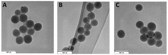 TEM images of the differently functionalized SiNPs for determination of primary particle size (A) SiNP, (B) SiNP_A, (C) SiNP_M, Size bar: 100 nm.