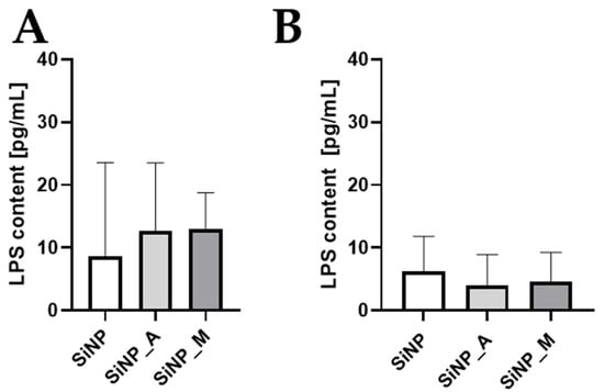 Quantification of LPS content by (A) HEK blue assay and (B) monocyte activation test (MAT) to analyze LPS contamination in the SiNP samples and Bet v 1. The LPS content was quantified based on LPS standard curves. The data are presented as mean ± SD (n = 4).