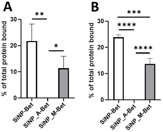 The binding efficiencies of differently functionalized SiNP samples were determined (A) directly from the pellet by SDS-PAGE and (B) indirectly from the supernatant by BCA assay. The data are presented as mean ± SD (n = 4) * p ≤ 0.05; ** p ≤ 0.01; *** p ≤ 0.001; **** p ≤ 0.0001.