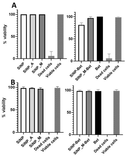 Finally, the hydrodynamic sizes and distributions of the particles were determined by NTA and DLS (weighted for number and intensity, Figure S5). The SiNPs displayed an intensity-weighted mean hydrodynamic size of 99.0 ± 42.4 nm (SiNPs), 114.5 ± 58.9 nm (SiNP_M), and 108.0 ± 46.4 nm (SiNP_A) by DLS, which were in good agreement with NTA (Table 1). The intensity-weighted values and distributions (Figure S5A–F) show that for most of the particles, small agglomerates were abundant in suspension, whereas the number-weighted distributions (Figure S5G–I) indicate the presence of still non-agglomerated particles, since their sizes match the values obtained from TEM (Figure 1). From all the characterization data, it can be concluded that the functionalization worked efficiently and both the functionalized and SiNPs exhibited a hydrodynamic size of about 100 nm in dispersion.