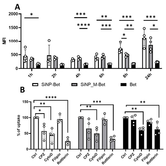 Impact on the uptake of allergen by moDCs. (A) Kinetics of uptake represented as mean fluorescence intensity (MFI) over the course of 24 h with SiNP-Bet, SiNP_M-Bet, and Bet. (B) Inhibition of uptake with the endocytosis inhibitors chlorpromazine hydrochloride (CPZ), cytochalasin D (CytoD), filipin, and rottlerin after stimulation with moDCs for 24 h (n = 4 individual donors). The data are presented as mean ± SD (* p ≤ 0.05; ** p ≤ 0.01; *** p ≤ 0.001; **** p ≤ 0.0001).
