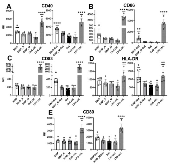 Co-stimulatory molecule expression by stimulated moDCs with functionalized SiNPs and Bet. (A) CD40, (B) CD86, (C) CD83, (D) HLA-DR, and (E) CD80 were analyzed. LPS was used as the positive control and a statistical significance was observed in comparison to the cell control indicating a successful stimulation. All particles and conjugates were compared to Bet v 1 for statistical analysis (n = 6 individual donors) (* p ≤ 0.05; ** p ≤ 0.01; **** p ≤ 0.0001).