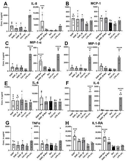 Cyto-/chemokine release of APCs. (A) IL8, (B) MCP-1, (C) MIP-1α, (D) MIP-1 β, (E) IL-4, (F) IL-6, (G) TNFα, (H) IL1-RA. LPS was used as the positive control and a statistical significance was observed in comparison to the cell control, indicating successful stimulation. The particles were compared to Bet v 1 for statistical analysis (n = 5 individual donors) (* p ≤ 0.05, *** p ≤ 0.001; **** p ≤ 0.0001).