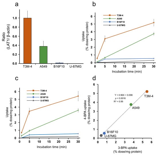 In vitro cell uptake of 3-BPA and 4-BPA in cancer cells with various LAT1-expression. (a) The LAT1/β-actin ratio of each cell calculated from the expression levels of LAT1 and β-actin obtained by Western blotting and standardized to a value of 1 for T3M-4. (b,c) LAT1-specific accumulation (the difference in accumulation between the inhibitor group and the noninhibitor group) in T3M-4, A549, B16F10, and U-87MG cells after 1, 5, and 30 min incubation with 3-BPA (b) and 4-BPA (c). (d) The relationship between the uptake (% dose/mg protein) of 3-BPA and 4-BPA at 30 min incubation with a simple linear regression. Statistical analyses of LAT1-specific accumulation of 3-BPA (b) and 4-BPA (c) were shown in Supplementary Tables S3 and S4, respectively.