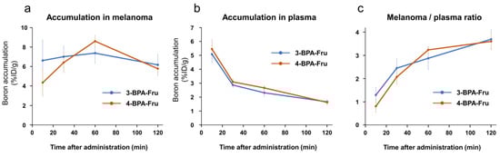 Boron accumulation in B16F10 melanoma (a) and plasma (b), and melanoma to plasma ratio of boron accumulation (c) of 3-BPA-Fru and 4-BPA-Fru at 10, 30, 60, and 120 min after administration.