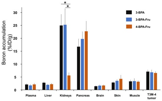 Boron accumulation in T3M-4 tumor, plasma, liver, kidneys, and the tissues surrounding the tumor at 60 min after administration of 3-BPA, 3-BPA-Fru, and 4-BPA-Fru into BALB/c nu-nu mice. * p < 0.001 by Tukey’s multiple comparison tests.