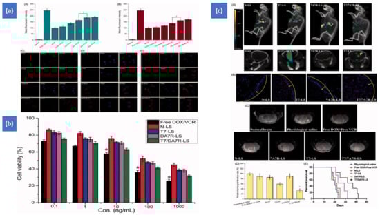 Figure 3. Targeted liposomes having two peptides (TfR- and VEGFR2-specified peptides) and two antitumor agents (doxorubicin and vincristine). (a) Cellular uptake (After 2 h at 37 °C, cellular uptake of Cy5.5-loaded liposomes of varying densities of T7 (A) and DA7R (B) in C6 cells. The cells’ auto-fluorescence was used as the control. Cellular uptake of varied Cy5.5 loaded lyposomes by bEND.3 cells (C), HUVECs (D), and C6 (E) cells); (b) cytotoxicity study (The cytotoxic activity of free DOX + free VCR, as well as some liposomes containing DOX and VCR); (c) biodistribution study (The biodistribution of Cy5.5 in varied liposomes in mice with intracranial C6 glioma was ascertained using an IVIS® Spectrum-CT (A). A CLSM was used to show the allocation of Cy5.5 in the brains of mice with intracranial C6 glioma (B). 16 days after inoculation, MRI of physiologic and pathological brains (C). Glioma tumor cell division rate in the brain (D). Survival curves according to Kaplan–Meier (E). The yellow line represents the intracranial glioma margin, and the arrow represents the glioma cells. The red is Cy5.5, and the nuclei are stained with DAPI (blue). Effectiveness after treatment with different formulations at 1 mg/kg (DOX 0.8 mg/kg + VCR 0.2 mg/kg) on days 8, 10, 12, and 14 after inoculation.) This designed system could go through the blood–brain barrier and blood–tumor barrier, with enhanced cellular uptake and cytotoxicity []. Copyright 2017, Taylor & Francis Journals. * p < 0.05.