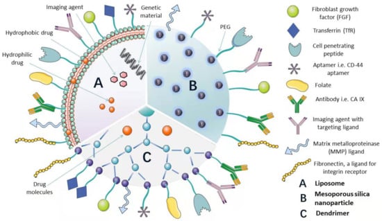 Targeting ligands commonly used are antibodies or antibody fragments, cell-targeting peptides or cell-penetrating peptides, and small molecules such as folate, based on their use in tumor therapy and aptamers. Some are shown in Table 1.