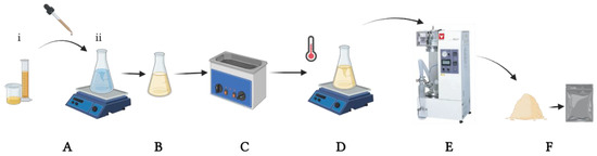 Experimental spray-drying process. (A) Quercetin solution (1:5 ethanol: water) (i) was added drop-by-drop to inulin solution (ii). (B) Mixed solution, inulin and quercetin homogenization. (C) Sonication at 25 °C for 30 min. (D) Final solution was agitated and maintained a specific temperature before and during drying. (E) Yamato model spray dryer. (F) NQs in a dust formulation were stored in dark conditions.