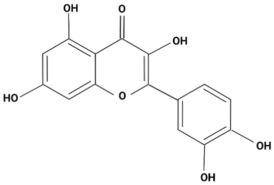 Quercetin is a flavonoid and natural antioxidant that is extracted from vegetables and fruits to treat many diseases. Quercetin was shown to exert beneficial health effects in various animal and human cellular models by modulating signaling pathways and the gene expression involved in these processes [9]. The intake of quercetin has a positive correlation with the promotion of health. It can be ingested as a supplement, with a recommended daily intake of between 200 and 1200 mg, or as a nutraceutical through functional foods, at quantities of between 10 and 125 mg per serving [10].