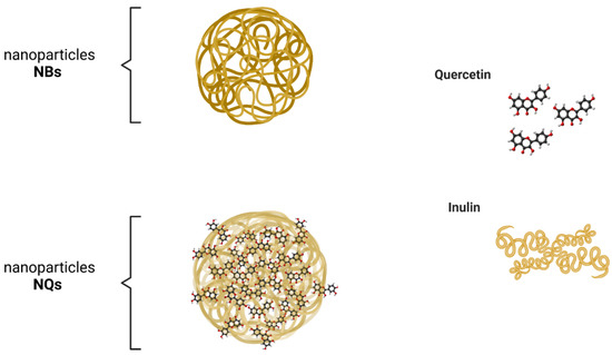 Schematic illustration of synthetized nanoparticles. NBs are the potential structure of unloaded inulin nanoparticles. NQs represents the potential structure of inulin nanoparticles loaded with quercetin by spray drying.