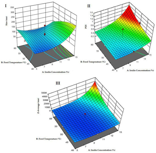 Optimization surface graphs. (I) Surface plot for size response (nm), p-value of 0.023. (II) Surface graph for the analysis of the polydispersity index (PDI) response, with a total p-value of 0.683. (III) Surface graph for the analysis of the Z-Average response, with a p-value of 0.217.