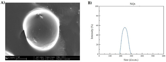 Size characterization of nanoparticles loaded with quercetin. (A) SEM image of inulin nanoparticles loaded with quercetin (NQs) (5000× magnification, scale 3 µm). (B) DLS NQs reconstituted in organic solvent (absolute ethanol).