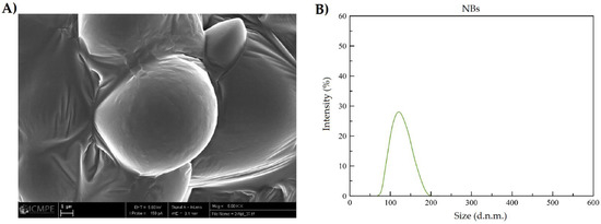 The results obtained by DLS showed an increase in size of 95% between NBs and NQs (Figure 5B and Figure 6B), which confirms the encapsulation of quercetin. The size distribution for NQs was 220–240 nm, which was comparable with the results obtained by Charoenwongpaiboon et al. [38], where the sizes were dependent on the temperature and pH, with dimensions between 95.9 and 115.7 nm for temperatures between 50 and 40 °C. Jiménez-Rodriguez et al. [39] mentioned that molecular weight plays a vital role in the self-assembly of nanoparticles; they noted that the lower the molecular weight, the smaller the nanoparticles obtained. This effect is possible due to the length of their branching; in Figure 5B and Figure 6B, taken by SEM microscopy, it can be seen the NQs and NBs were spherical and had slightly rough surfaces. The images show areas with a high degree of agglomeration. This presence of aggregations and variation in the load of the active principle was influenced by: the collision between particles in the spray-dried equipment, either in the drying zone or in the cyclone zone, or the effect of elevated temperatures on the inulin, which originated from an adhesion between particles of varied sizes [40,41]. Furthermore, in Table 3, it is shown that the sizes of NQs and NBs were influenced by the medium in which the nanoparticles were suspended; in an aqueous medium, a slight relaxation of inulin was reported, with pores generated in the matrix and a swelling of the sphere, due to the relaxation of the polymeric chains. This normally occurs in nanoparticles with inulin form a hydrophilic layer [42].