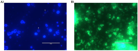 Fluorescence Microscopy (FM) measurements were carried out on an EVOSFLc inverted fluorescence microscope (Thermo Fisher Scientific, Waltham, MA, USA). Two fluorescence filters, DAPI (352–477 nm) and GFP (457–538 nm), were used, with an image magnification of 60×.