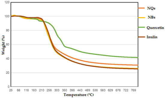 The high thermal stability of inulin and quercetin has been reported. For example, Wahbi [49], analyzed the thermal behavior of an inulin extract that started to decompose at ≈235 °C [49], and of raw inulin at 215 °C [50]. On the other hand, the reported thermal degradation of quercetin was observed between 245 and 390 °C [36], which is similar to the results obtained in the present project (Figure 8). The observed higher temperatures range of NQs could be due to the physical and chemical interactions created between both inulin and quercetin [49]. No thermal data were found in the literature to directly compare the thermal behavior of NBs and NQs.