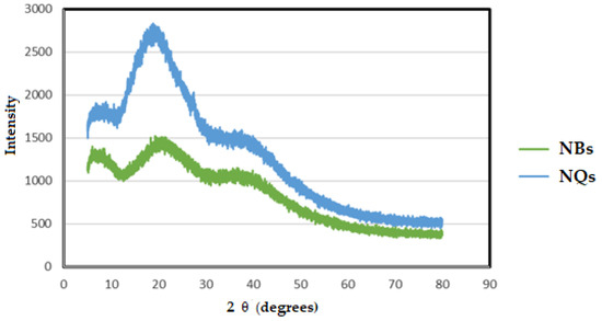 NQs and NBs presented an amorphous XRD pattern that was similar to inulin, and these patterns coincided well with previous studies [51,52]. Although quercetin is reported to have a crystalline structure, its addition to the NBs improves the amorphous phase by incrementing the intensity of the signals, with this being due to the chemical interaction between both compounds [36].