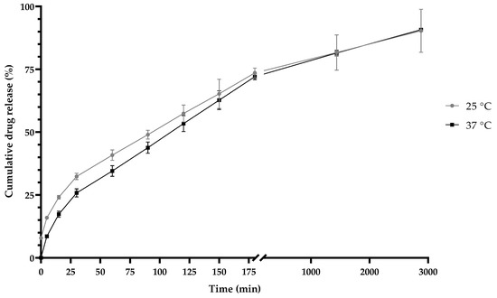 Two calibration curves were formulated (pH 7.4, at 25 °C, R2 = 0.9911; pH 7.4, at 37 °C, R2 = 0.993). All experiments were performed in triplicate.