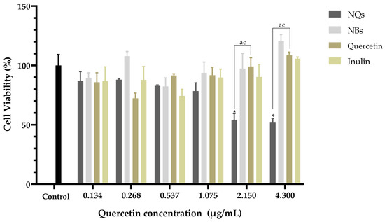 Cell viability in human colorectal cancer cells (Caco-2). Cell viability (%) of inulin nanoparticles loaded with quercetin (NQs), inulin non-charged nanoparticles (NBs), quercetin and inulin at different concentrations (4.3 to 0.134 μg/mL) in human colorectal cancer cells (Caco-2) after 24 h, determined by MTS assay. Values are expressed as mean ± SD. Controls are untreated cells. Significant differences among treatments in the cell lines were determined based on Dunnett multiple comparison test (p ≤ 0.05) where * control vs. NQs. Significant differences were determined based on the Student’s t-distribution (p ≤ 0.05) where ac represents NQs vs. quercetin.