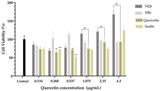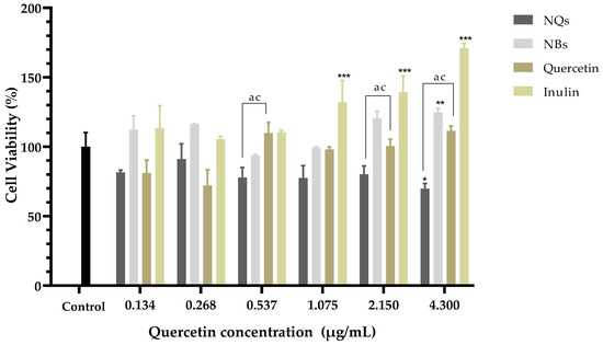 Cell viability in hepatocellular carcinoma (HepG2). Cell viability (%) of inulin nanoparticles loaded with quercetin (NQs), inulin non-charged nanoparticles (NBs), quercetin and inulin at different concentrations (4.3 to 0.134 μg/mL) in hepatocellular carcinoma (HepG2) after 24 h determined using the MTS assay. Values are expressed as mean ± SD. Controls are untreated cells. Significant differences among treatments in the cell lines were determined based on Dunnett multiple comparison test (p ≤ 0.05) where * represents control vs. NQs, ** represents control vs. quercetin and *** represents control vs. inulin. Significant differences were determined based on the student’s t-distribution (p ≤ 0.05) where ac represents NQs vs. quercetin.