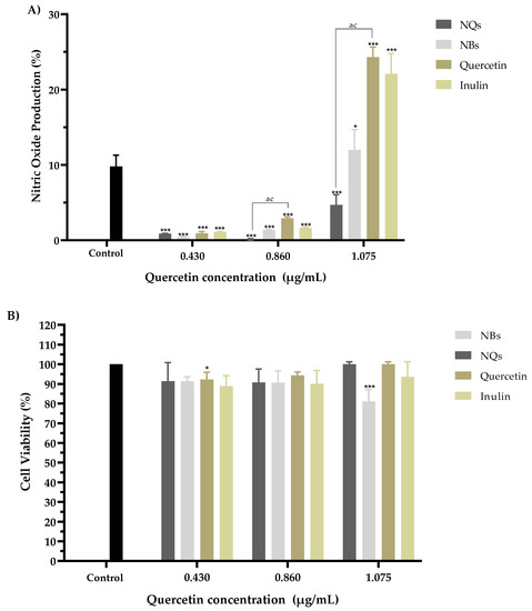 Murine macrophage cells (RAW 264.7) were cultured in DMEM-F12 (Gibco©, Grand Island, NY, USA) supplemented with 10% FBS and 1% of the commercial streptomycin-penicillin mixture (Pen Strep Gibco©, Grand Island, NY, USA), and then incubated at 37 °C in a 5% CO2 atmosphere (NuAire, Plymouth, MN, USA). Cells were seeded in 96-well plates (5 × 10 5 cells/mL) and allowed to adhere for 24 h. The next day, 50 μL of all samples were added, all samples were standardized to the quercetin concentration, and inulin non-charged nanoparticles (NBs) were used as a negative control. After 4 h, half of the wells were stimulated with lipopolysaccharides (LPS) from Salmonella enterica serotype typhimurium (L7261, Sigma-Alrich, St. Louis, MO, USA) at 10 µg/mL (final concentration), while the other half were used as controls for each sample.