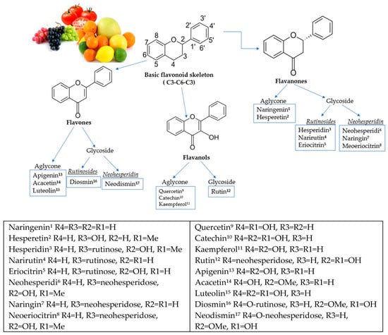 Flavanones in citrus fruits are in glycoside or aglycone forms [13]. Of the aglycone forms, the essential flavanones are naringenin and hesperetin. Glycosides are divided into two types: neohesperidosides (e.g., naringin), which have a bitter taste, and rutinosides (e.g., hesperidin, narirutin, and didymin) (Figure 1) [14,15]. The characteristic flavor of citrus fruits is caused by flavanones, usually diglycosides. The molecular structures of flavonoids are provided in Figure 1.