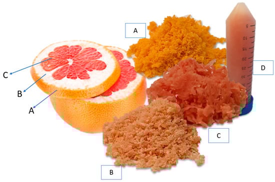 The grapefruit fruits (Citrus × paradisi L., variety Star Ruby, Italy, region—unknown) were collected from the local market in Mastaičiai, Kaunas district, Lithuania. The fruit were separated into the flavedo, albedo, and segmental parts, then chopped up with a food processor and frozen in a freezer (−18 ± 0.9 °C) until extraction. The parts of the fruit used in this study are shown in Figure 3.
