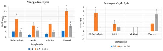 Comparison of the extraction yields of naringin and naringenin obtained with and without hydrolysis. ᵃ p < 0.05 when compared to extraction without hydrolysis. Extract ID and preparation conditions are displayed in Table 1.